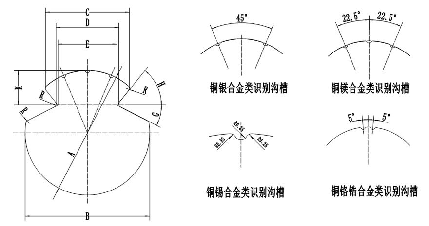 E- (溝)槽尖間距;K-頭部高度;R-圓角半徑;G-下斜角;H-上斜角;